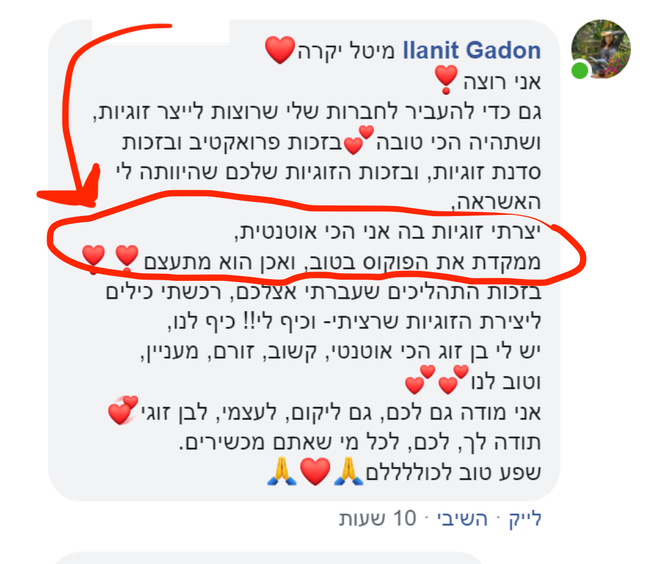 כשהבינה שהפער הוא לא בזוגיות - אלה בינה לבין עצמה, היא הצטרפה לזוגיות פרואקטיבית- וסגרה את הפער הזה.